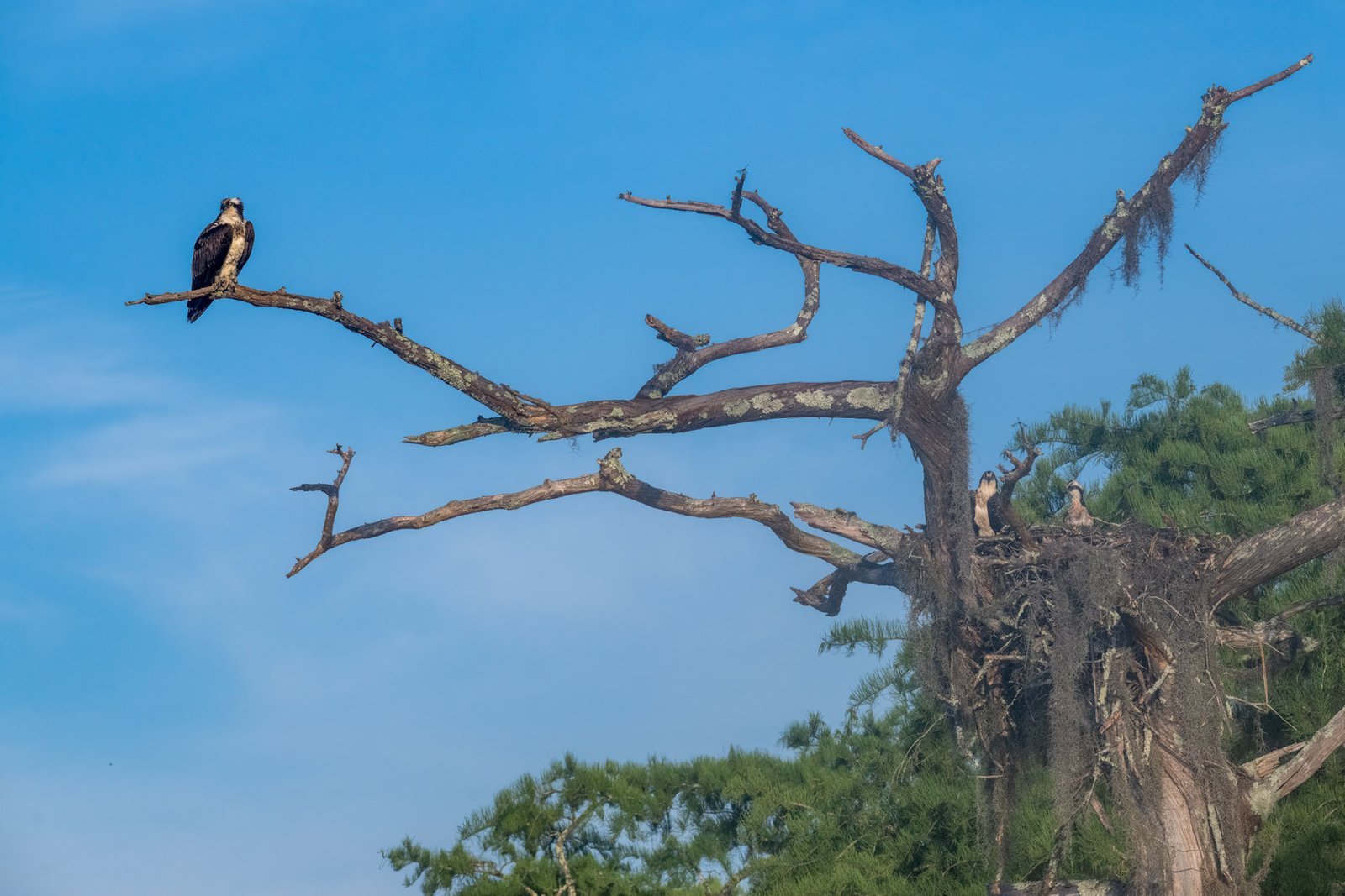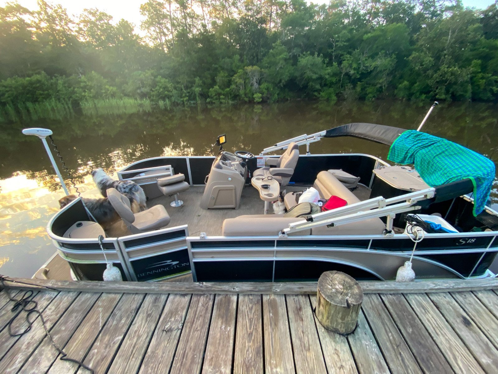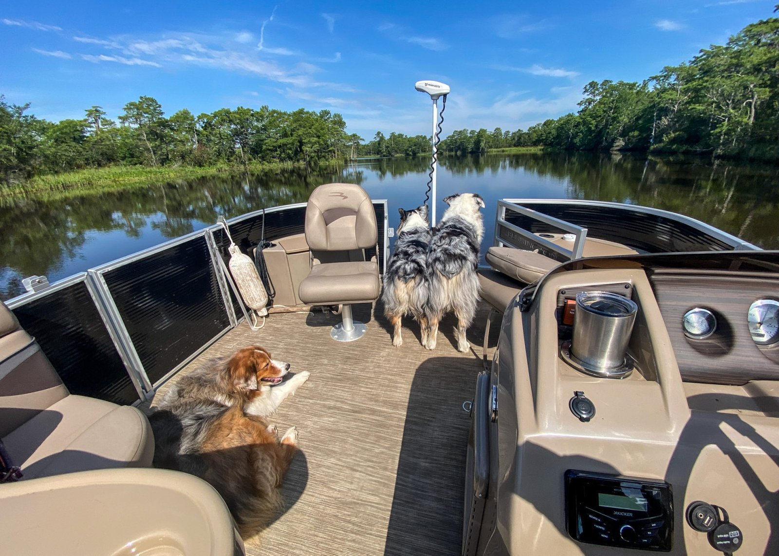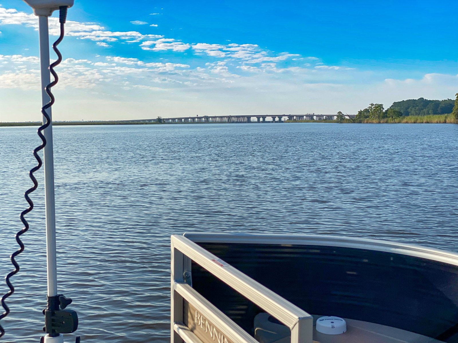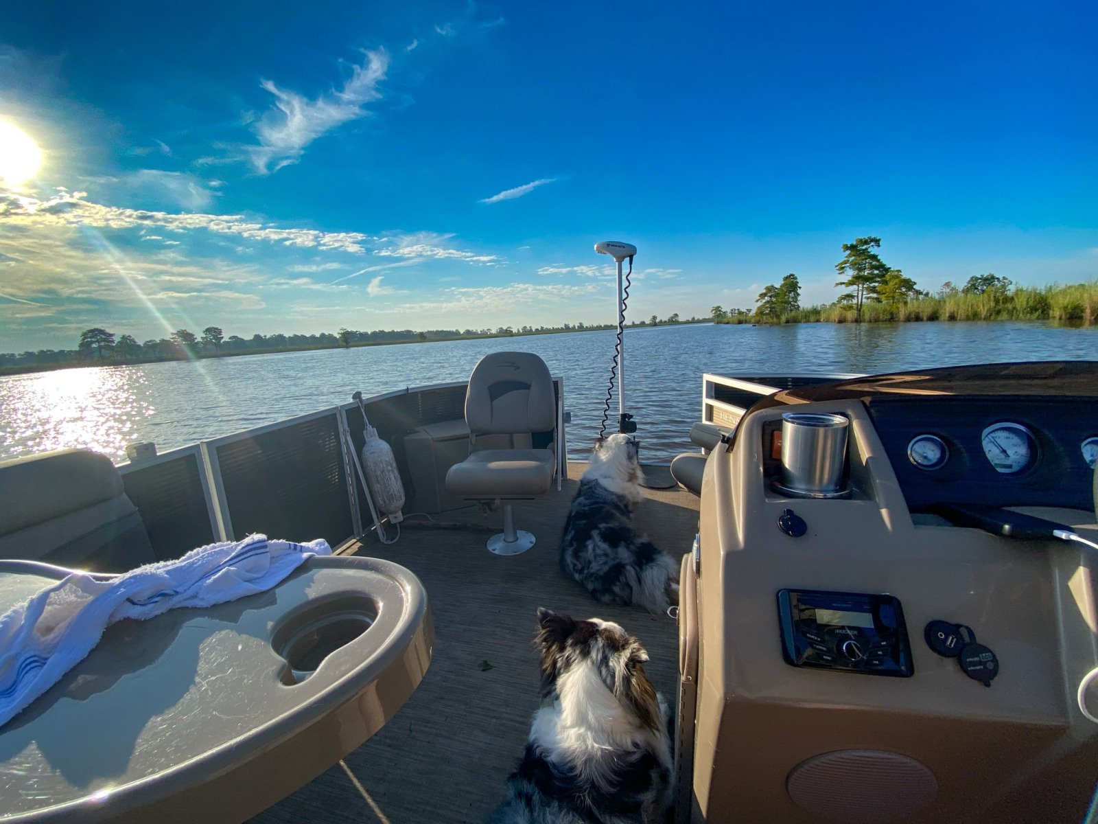 Yesterday morning, at daylight, the kids and I launched the Bird Barge at the Barge Landing Boat ramp, Vancleave, Mississippi, near the headwaters of Bluff Creek. It was a gorgeous morning; the river, though flowing pretty well, was like glass. We had no particular destination but a full tank of fuel and two fully charged trolling batteries. When it is Patty, the kids, and I, we travel slowly, Patty listening and both of us on the lookout for birds. In this case, the kids and I averaged 14 MPH. The Bird Barge is very efficient with fuel, is very quiet, and doesn’t disturb the water much. Just enjoying the beautiful morning.