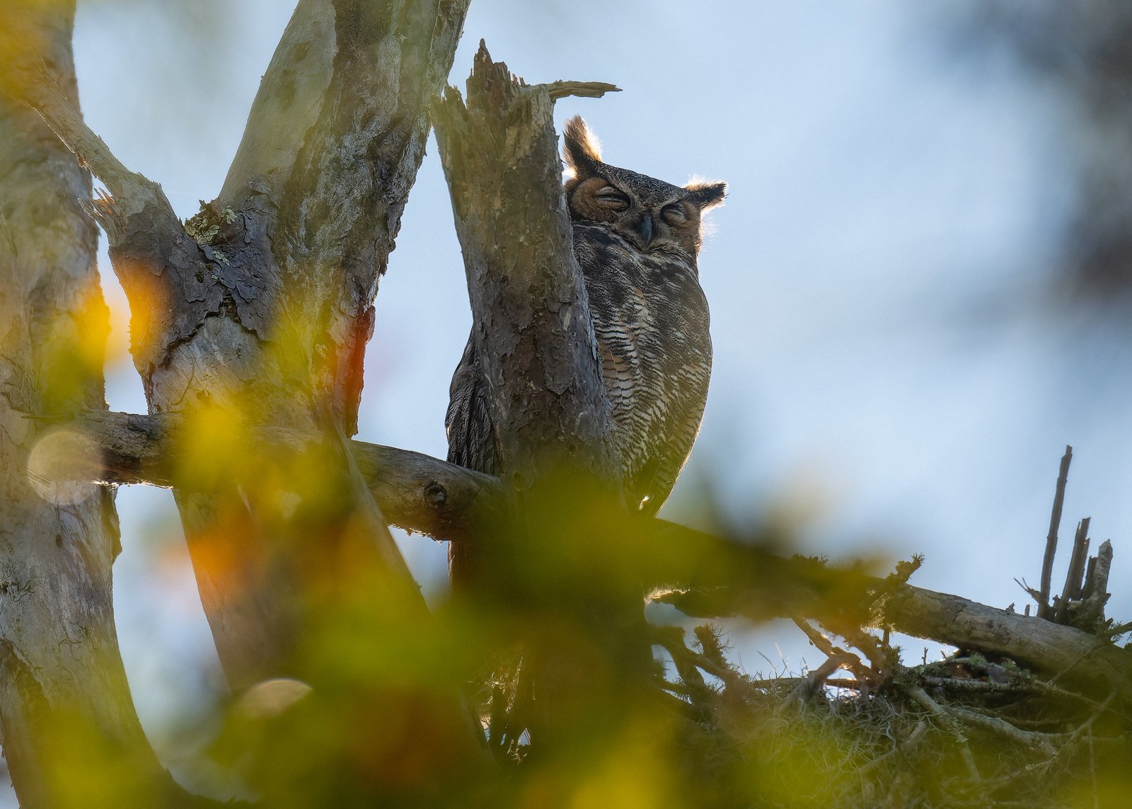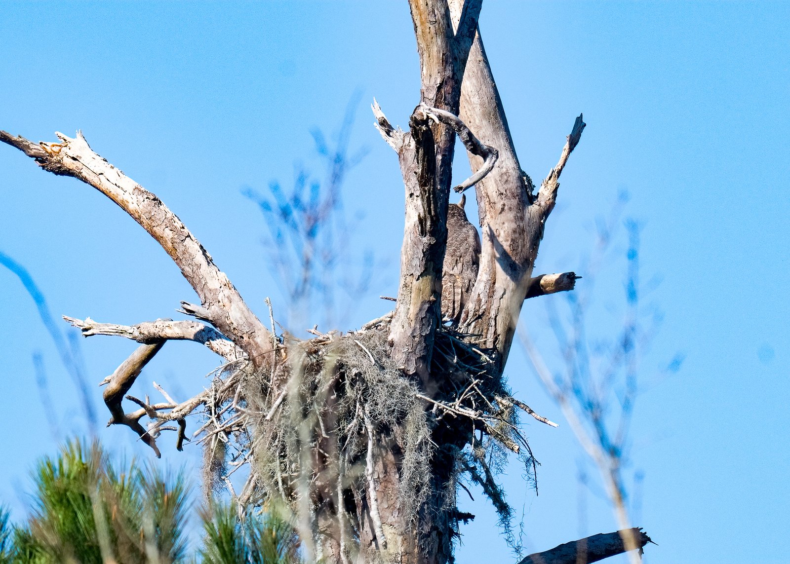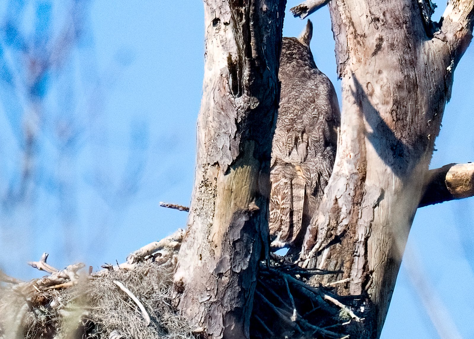 It turned out to be a beautiful day. We stopped at Gulf Island National Seashore Park and took a panorama to give you an idea of what the Davis Bayou Coastal Preserve looks like. We saw the Adult Great Horned Owl sitting on the edge of their nest. Occasionally, a tiny head would pop up, too small to see in the photo yet, but in another week or so, we will start to see the fledglings.
